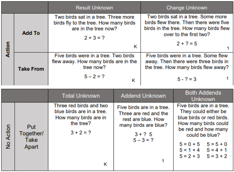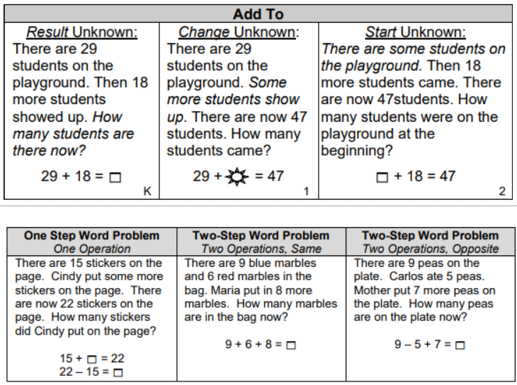 For example, with an add to/result unknown problem, students might pick the first number, write it down, pick the second number, write it down, and then add them together because that’s what the problem type calls for. However, they can do this without having comprehension.