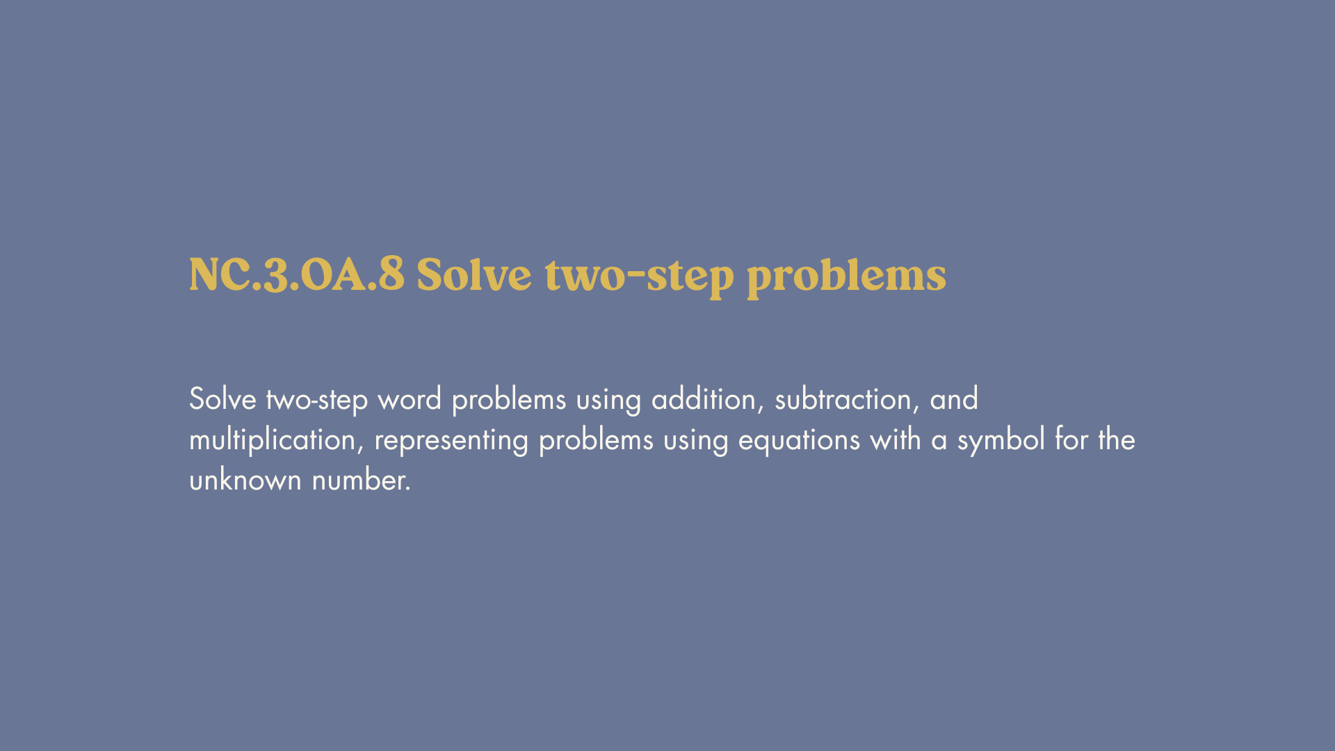 In the 3rd-grade standards, students tackle two-step problems with unknown values in any position and represent the unknown with a letter.